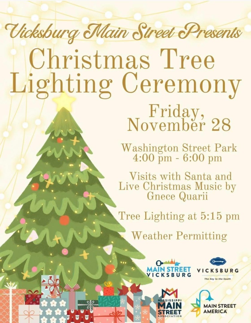 The City of Vicksburg Tree Lighting presented by Vicksburg Main Street begins at 5:00 pm at Washington Street Park. Join us for live Christmas music and special guests. For more information call 601-634-4527.