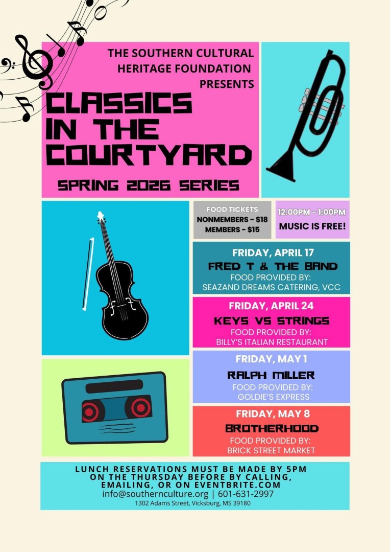This event will be from 12:00 pm until 1:00 pm at the Southern Cultural Heritage Foundation, 1302 Adams Street. The free musical entertainment is Keys vs Strings, and lunch by Billy’s Italian Restaurant can be purchased for $18 for non-members or $15 for SCHF members. Reservations are required for lunch and must be made by 5:00 pm on the Thursday before the event. To make a reservation for lunch, please call the SCHF office at 601-631-2997 or email info@southernculture.org, org get your lunch ticket on Eventbrite.com.
