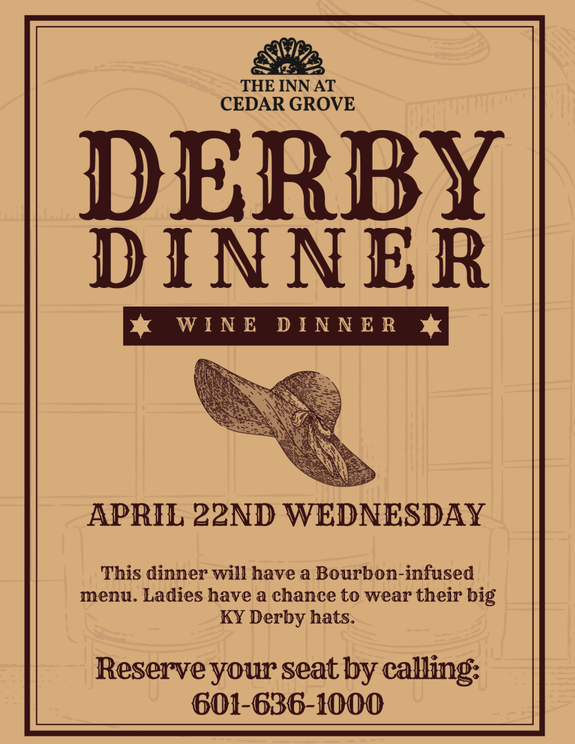 The event begins at 6:15 pm at The Inn at Cedar Grove, 2200 Oak Street. The cost is $65 without wine pairing and $85 with the wine pairing. For more information call 601-636-1000.