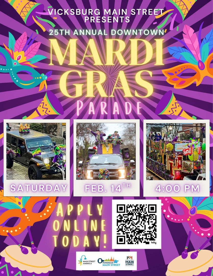 The parade will begin at 4:00 pm in downtown Vicksburg. This is an annual parade to celebrate Fat Tuesday and Mardi Gras! Bring the family for food, floats and fun! For more information, call 601-634-4527.