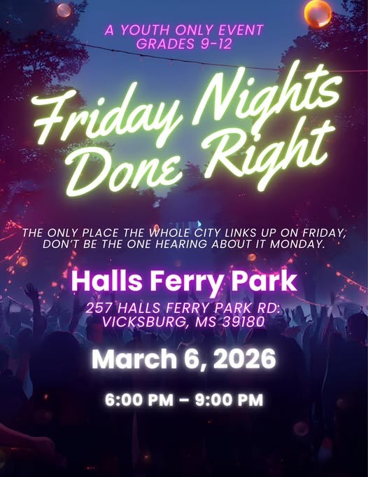 This event will be from 6:00 pm until 9:00 pm at Halls Ferry Park, 257 Halls Ferry Park. This is a youth centered event for grades 9th through 12th. For more information, call 601-801-3411.