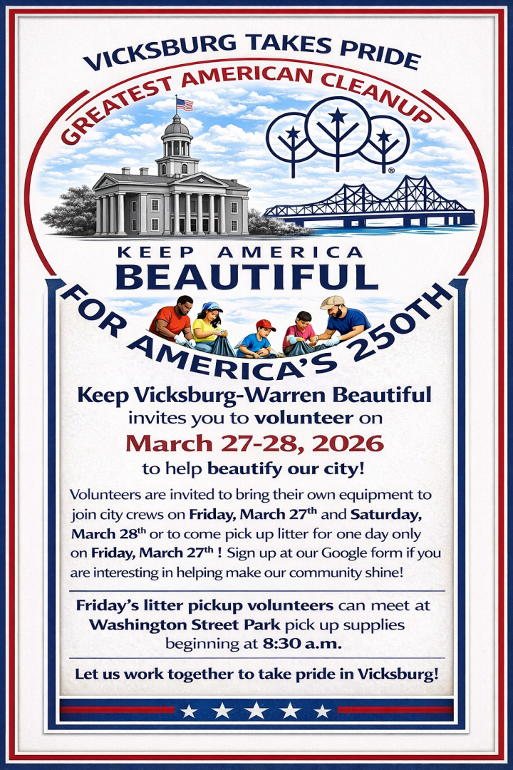 This event will be at 8:30 am at Washington Street Park, 1007 Washington Street. Volunteers are invited to work with city crews to help beautify the city. Cleanup will be on both days, but supplies will only be available to pick up on Friday. For more information email keepvicksburgbeautiful@gmail.com.