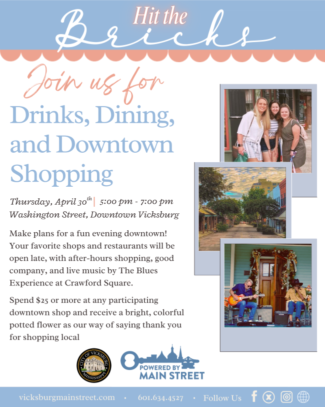 This event will be from 5:00 pm until 7:00 pm on Washington St. Visit your favorite downtown businesses. Enjoy extended business hours with an evening of shopping and live music at Crawford Square. For more information call 601-634-4527.