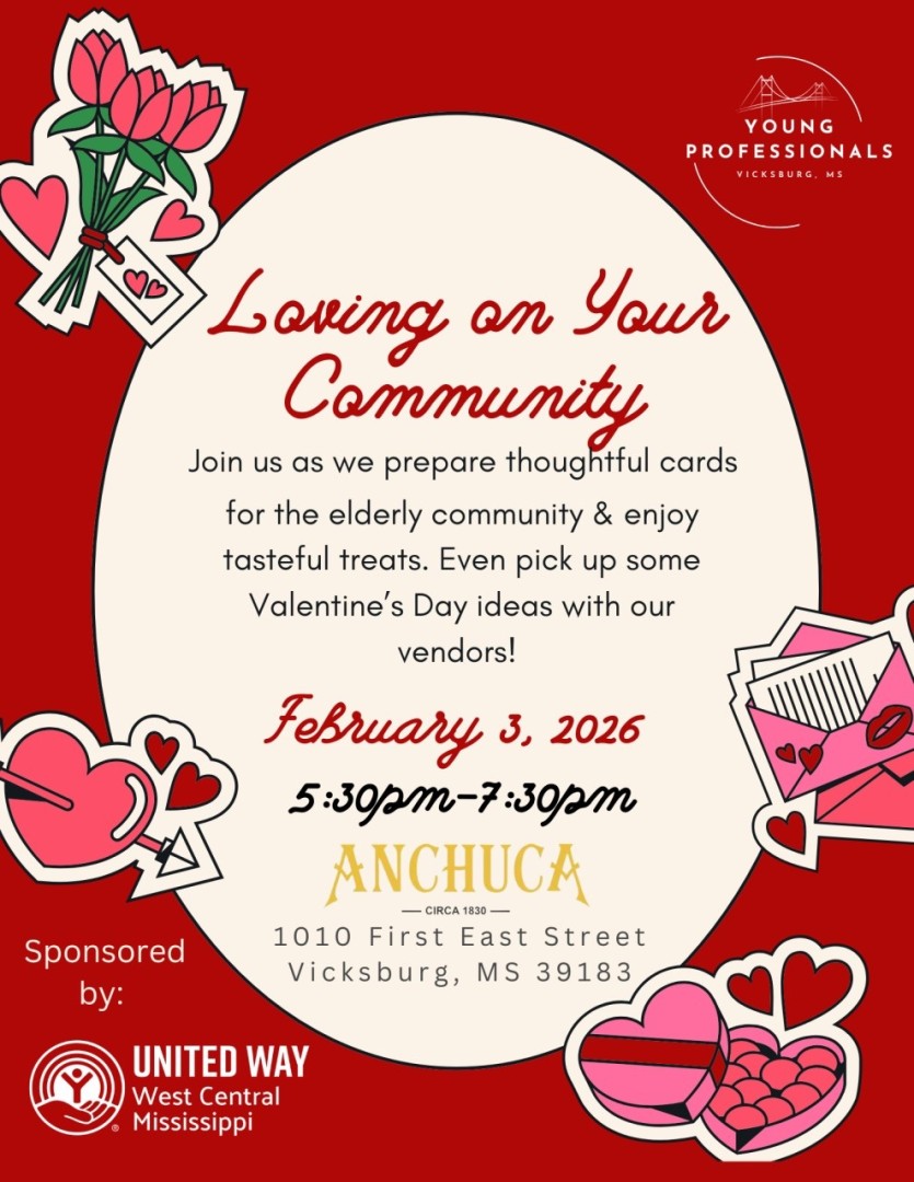 This event will be from 5:30 pm until 7:30 pm at Anchuca Historic Mansion and Inn, 1010 First East Street. Join the Vicksburg Young Professionals Group and prepare thoughtful cards for the elderly community and enjoy tasty treats. For mor information call 601-636-1012.