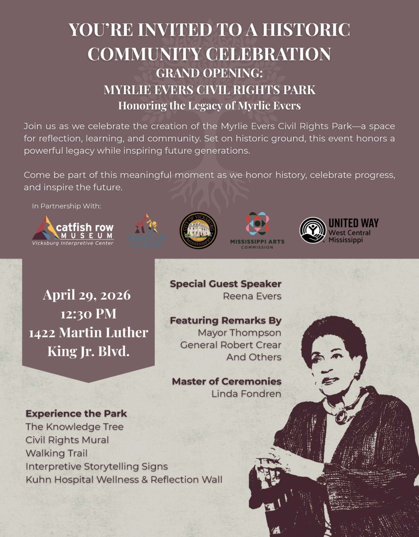 This event will begin at 12:30 pm at the Myrlie Evers Civil Rights Park, 1422 Martin Luther King Jr. Blvd. The grand opening will feature a special guest speaker, Reena Evers. Come and experience this new space that is ideal for reflection, learning and community. For more information call 601-801-3411.