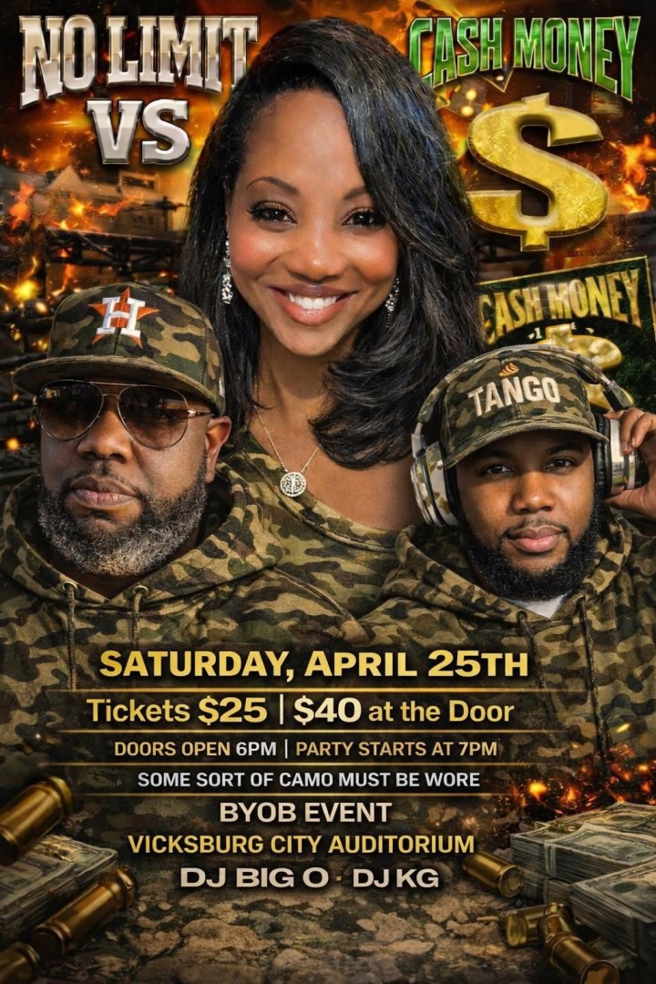 Doors will open for the event at 6:00 pm with the party starting at 7:00 pm at the Vicksburg City Auditorium, 901 Monroe Street. The event will feature music by DJ Big O and DJ KG. Some sort of camouflage clothing must be worn. The cost is $25 in advance and $40 at the door. For more information visit https://www.facebook.com/events/1277965501134640.
