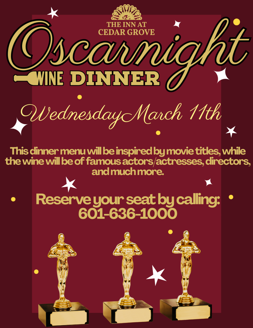 The event begins at 6:15 pm at The Inn at Cedar Grove, 2200 Oak Street. The cost is $65 without wine pairing and $85 with the wine pairing. For more information call 601-636-1000.
