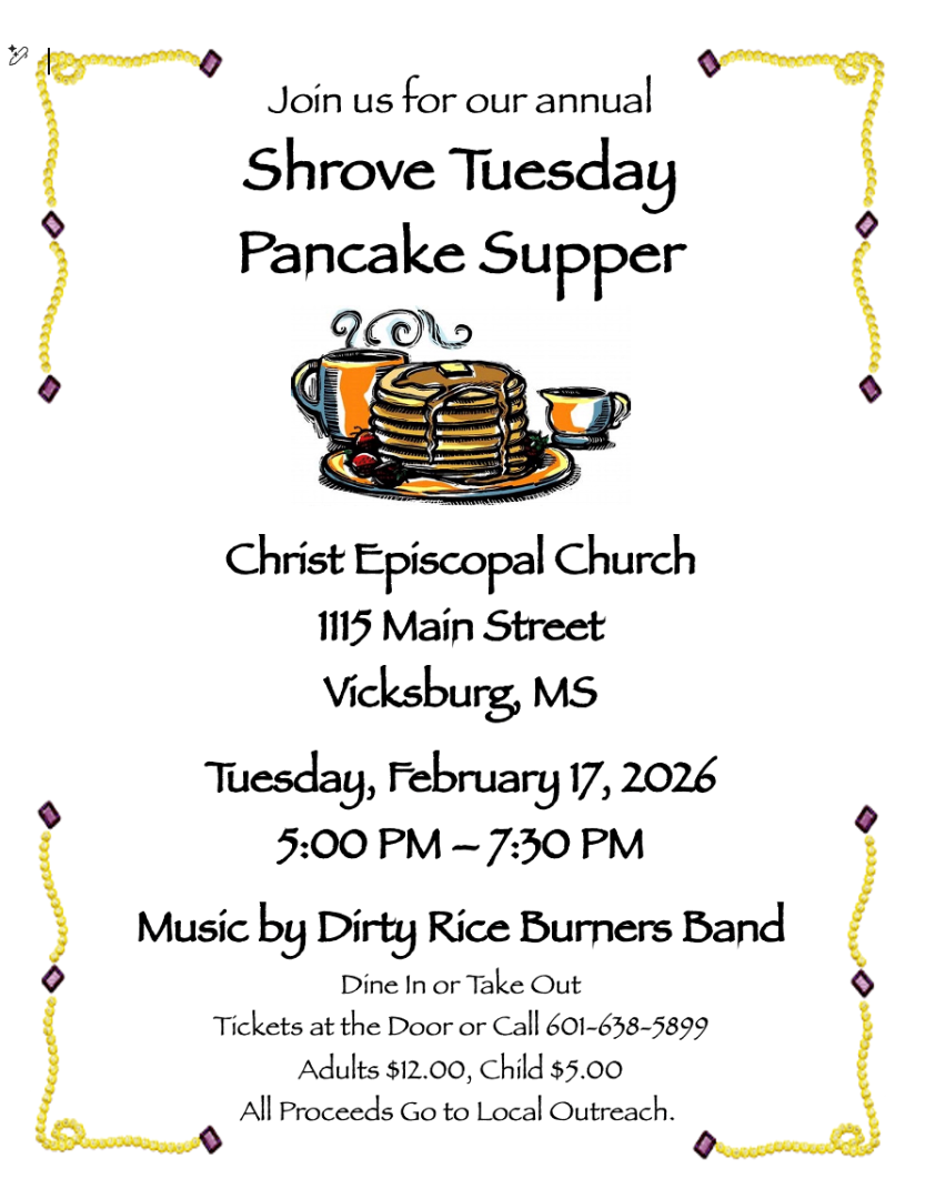 This event will be from 5:00 pm until 7:30 pm at Christ Episcopal Church, 1115 Main St. Tickets are available at the door or call for tickets in advance. Tickets for adults are $12, and $5 for children. Live music will be provided by the Dirty Rice Burners. All proceeds go to local outreach. For more information, call 601-638-5899.