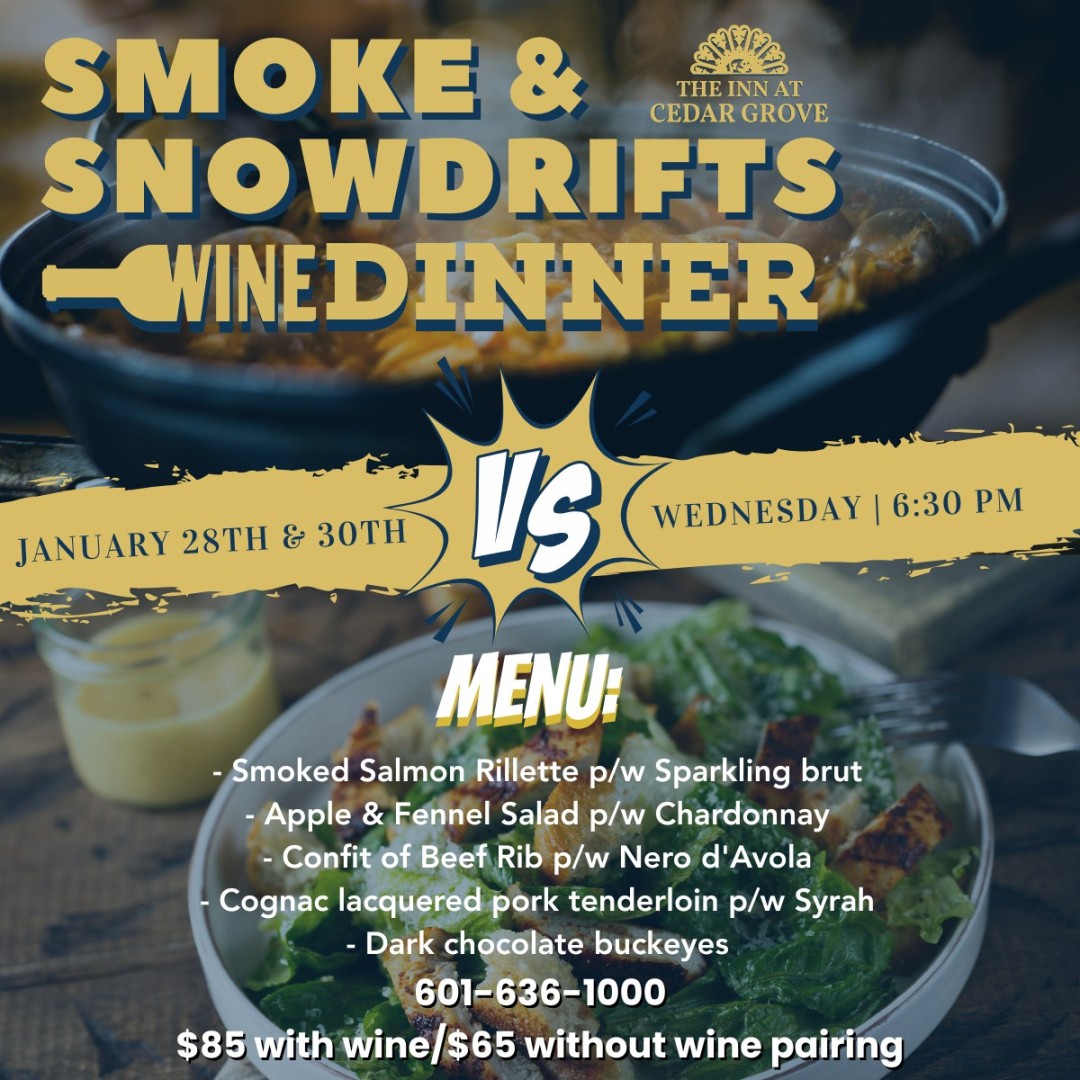 The event begins at 6:00 pm at The Inn at Cedar Grove, 2200 Oak Street. The event will begin with cocktails at 6:00 pm and dinner will be served beginning at 6:30 pm. The cost is $65 without wine pairing and $85 with the wine pairing. For more information call 601-636-1000.