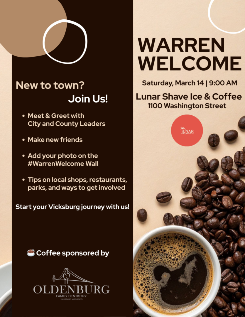 This event will begin at 9:00 am at Lunar Shave Ice & Coffee, 1100 Washington Street. If you are new intown come and enjoy the Warren Welcome event. For more information call 601-636-1012.